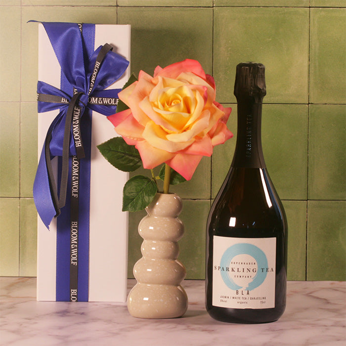 Een eenvoudig en verzorgd geschenk met de alcoholvrije Sparkling Tea BLÅ en een zijden bloem van Bloom & Wolf. Een passende combinatie voor verschillende momenten, zonder alcohol.