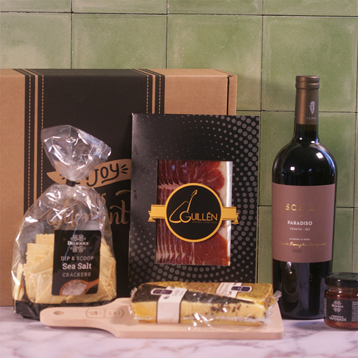 Dit is een heerlijk samengesteld pakket voor een ontspannen en smaakvolle borrel. De zachte maar karaktervolle rode wijn Scaia Paradiso vormt de perfecte combinatie met een selectie van luxe kazen en fijne charcuterie.